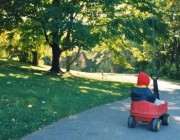 In my quest for a great stroller-accessible park, my wheels took me to Scarborough where I found a great paved trail in two adjoining parks with enough leafy woods to make it very pleasurable on a fall outings: Thomson Park and Birkdale Park. I really enjoyed the intimate feel of Birkdale Park. it is narrow, with plenty of curves and small valleys. The views are so diverse that you never know what awaits you around the next bend: small river, pastoral valley, maple trees, or majestic weeping willows. We entered the park from its entrance on Ellesmere Road. After a 20-minute stroll, we got to a playground alongside Brimley Street. Last stop! Everyone off the wagon to move a bit! If you want to push it further, walk south on Brimley to cross over to Thomson Park. (You'll need to walk another 15 minutes to reach the playground in Thomson park.) Birkdale Park is a 15-min. walk from Midland Subway Station.
