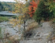 During the fall, Twyn Rivers is a real gem of a road in the midst of civilization. Breathtaking colourful leaves, white cliffs, a crossroad passing over two small bridges… and not a single house in sight! The drive on Twyn Rivers Drive leads to a large parking lot. From there, we took a trail along the river and crossed a bridge. We then took the trail off the road. It eventually started to run up a steep hill to our right. We first explored the right-hand side of the fork we found up the hill. The path was really pretty, the black trunks contrasting with a colourful patch of trees on a hill in the far background. We then came back at the start of the fork to explore the left-hand side, which offered quite an interesting stroll. We took the first downhill trail to our right, aiming at the river. A strange vision of dark trees with peeling bark and tortuous branches among standing dead trunks awaited us. Soon after, following the sound of the river, we reached a postcard landscape of river and fall colours, complete with 50-cm trout jumping against the current! It took us approximately an hour to walk the whole loop back to the asphalt road and to the parking lot.