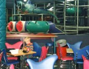 The apparent low height of the building from the outside is misleading because the interior is designed in split levels, with the play area actually nestled below ground level. The impressive indoor structure topped with a bright papier m?ch? dragon is the best climb we have tried. Adults and kids alike crouch to climb from one level of a net labyrinth to the next. It's the only way to reach the many slides, fire poles, tunnels, corridors outfitted with punching bags and ballrooms. We got "lost " in its net corridors and it was part of the fun! Some twenty token games are scattered around the structure, including an air hockey table which could make a few tokens go a long way. There's a smaller structure at the other end for smaller kids, as well as a room filled with big toys and gym cushions, ideal for toddlers.