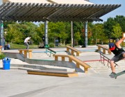 This skatepark is also a unique BMX heaven, with parallel dirt paths allowing healthy competition between friends. As I watched the skaters and riders in the skatepark, I saw the BMX bikes in the background, going up and down on the paths. It sure looked tempting! The impressive skatepark was rebuilt a few years ago. It has a 5-foot bowl transitioning to a 4-foot 1/4 pipe to 1/4 pipe hip, street design with rails, a 10-step, planter boxes and a pretzel, plus an visually interesting shade structure. Made for skateboards, in-line skating and BMX.